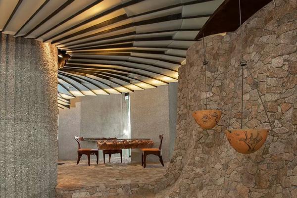 室內(nèi)設(shè)計師 John Vugrin 被這對夫婦委托深化室內(nèi),依然是信任和放手去干吧。John Vugrin 感動到哭,在這個建筑里花費了數(shù)年苦心工作。盡力將一張桌子一英寸鋪地都做到完美。內(nèi)部風(fēng)格近似純手工全定制的高迪風(fēng)格。在地面的鋪陳中,設(shè)計師頗用心,每個區(qū)域都使用不一樣規(guī)格相近色調(diào)的地磚,以不同的樣式拼貼,逐步上升到墻壁。屋頂?shù)牟A齑爸饾u下降到地面。兩者之間有海螺花紋的吊頂,將內(nèi)部空間與粗糙混凝土表面融為一體。最終交付時,每一盞燈都是定制設(shè)計的。