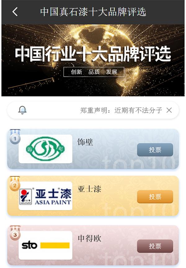 近日,由品牌網(wǎng)(10pinping.com)發(fā)起的2019年度中國真石漆十大品牌評(píng)選活動(dòng)如期進(jìn)行,此次活動(dòng)旨在推動(dòng)中國涂料行業(yè)品牌發(fā)展,構(gòu)筑建材行業(yè)品牌戰(zhàn)略?;顒?dòng)既吸引了如立邦、SKK等一大批國際品牌,也有吸引了飾壁、亞士漆等國內(nèi)知名涂料企業(yè)參選。截止記者發(fā)稿,飾壁、亞士漆和申得歐分別位列前三。